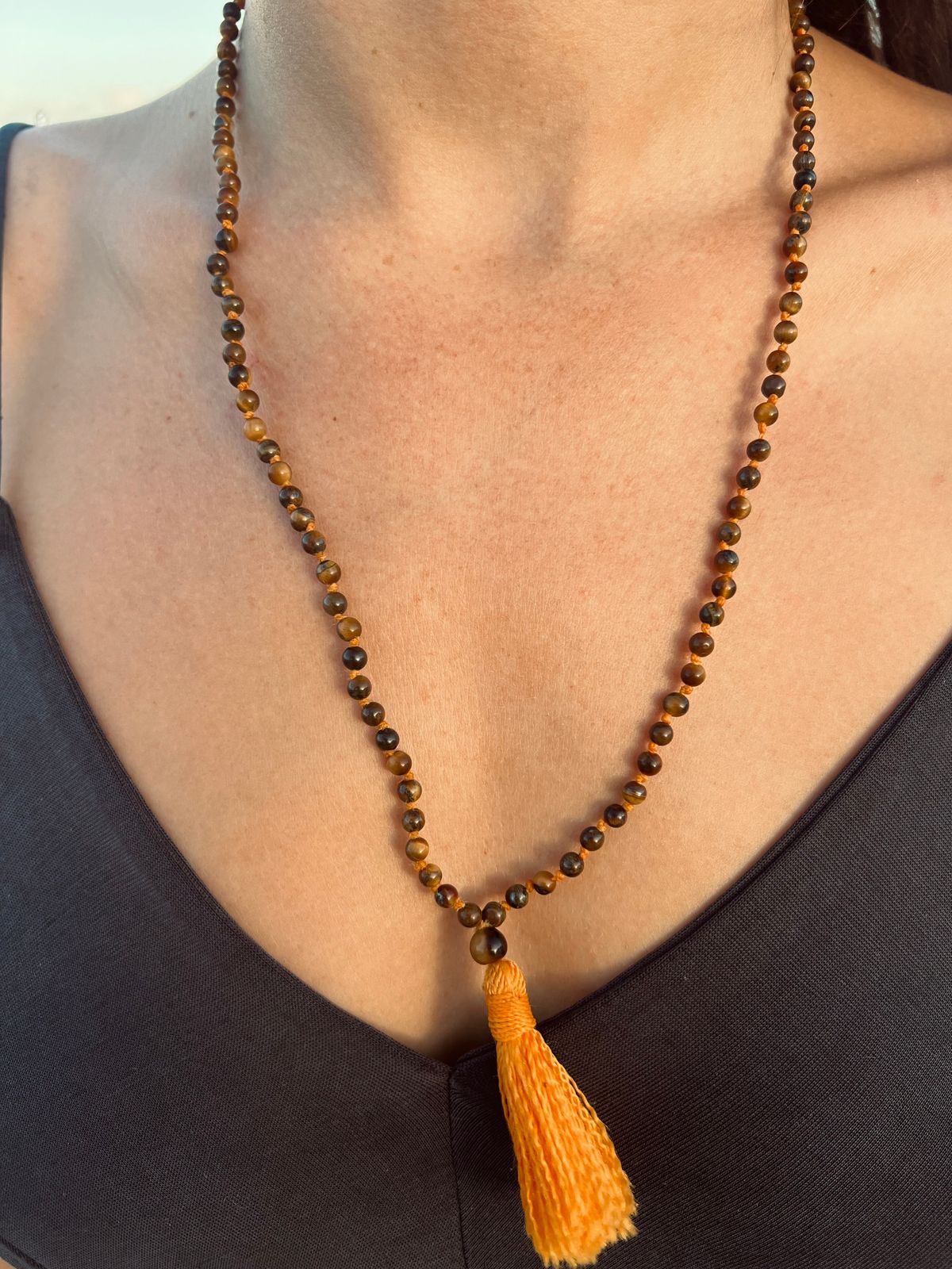 Hand-knotted by me, this Amaramala is made out of Tiger’s Eye stones, known for their grounding and protective properties. Each Mala consists of 108 beads, a sacred number with deep significance, and is finished with one more bead, called the Sumaru Bead. The 1 symbolizes you, the 0 represents all of us, and the 8 stands for infinity—together, they signify that we are all one, forever connected. This understanding was passed down to me by my teachers and resonates deeply.